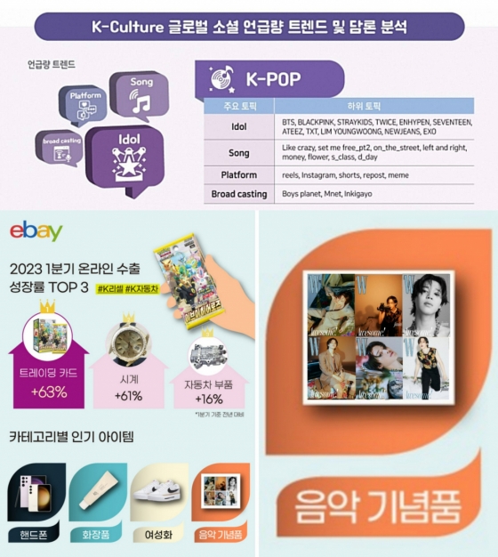 글로벌 커머스 플랫폼 ebay가 올해 1분기 한국 셀러 매출을 분석해 발표한 '온라인 수출 베스트(성장률 기준) 아이템' 분석결과 K팝 아이템이 해외 수출에서 강세를 보인 것으로 나타났고, K팝 인기 아이템에는 지민이 디올(DIOR)의 글로벌 앰버서더로 발탁된 후 2023 서머 컬렉션 의상을 완벽히 소화하며 표지를 장식한 'W코리아 2월호'가 포함된 바 있다.