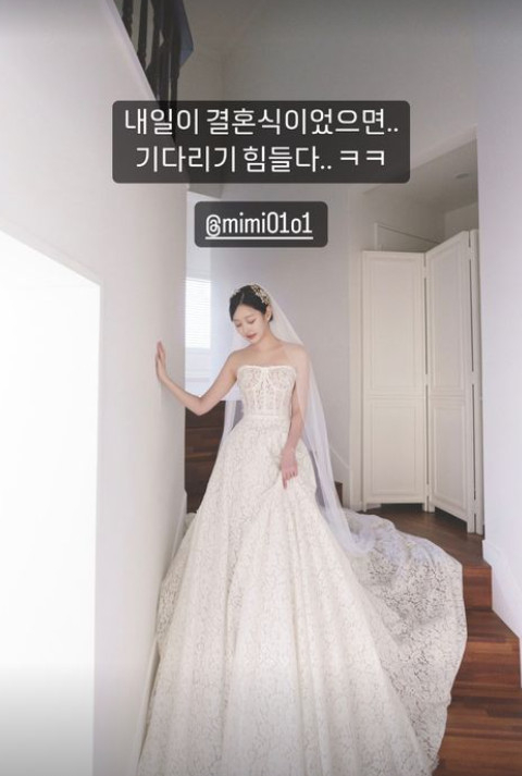 공개된 사진 속엔 결혼식을 앞두고 웨딩 드레스를 입은 미미의 모습이 담겨있다. 미미는 걸그룹 출신 답게 아름답고 부드러운 분위기를 풍긴다.