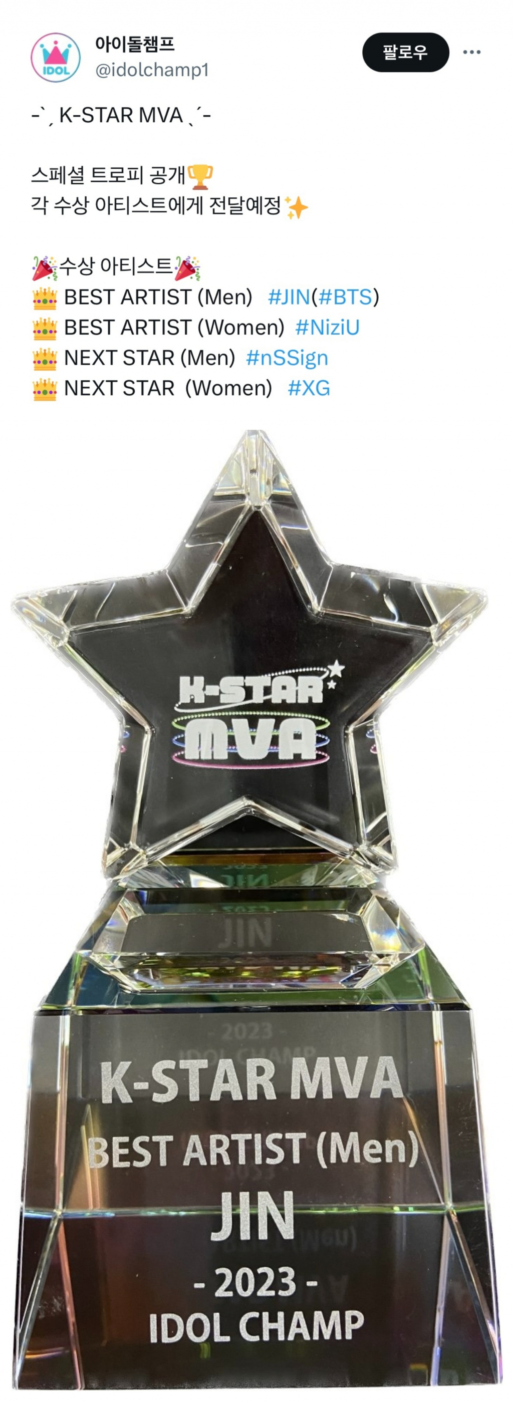 방탄소년단(BTS) 진이 한국과 일본에서 공동으로 진행된 'K-STAR MVA'에서 최고의 아티스트 남자 부문 1위에 오르며 빛나는 트로피의 주인공이 됐다.