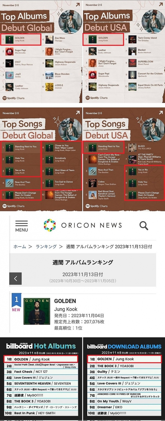 이와 함께 '톱 송 데뷔 글로벌' 차트에서는 1위 'Standing Next to You'를 비롯해 'Hate You'(헤이트 유) 2위 'Yes or No'(예스 오어 노) 3위,'Please Don't Change'(플리즈 돈트 체인지) 5위, 'Closer to You'(클로저 투 유) 6위, 'Somebody'(섬바디) 7위, 'Shot Glass of Tears'(샷 글라스 오브 티어스) 8위, 'Too Sad to Dance'(투 새드 투 댄스) 9위 등 'GOLDEN' 앨범에 수록된 총 8곡이 톱 10에 차트인 했다.