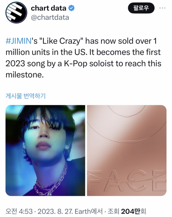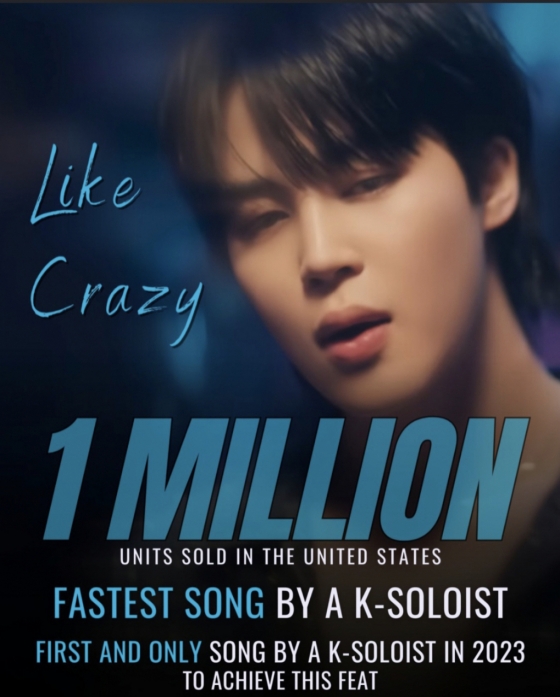 또한 지난 8월 27일 '라이크 크레이지'는 2023년 최초 한국 솔로곡으로 미국 100만 유닛 세일즈를 돌파해 미국 레코드 산업협회(RIAA=Recording Industry Association of America)로부터 플레티넘 인증(소속사가 협회 제출 인증) 자격을 받아 '짐메리카'라 불리는 미국 내 지민의 영향력을 보여줬다.