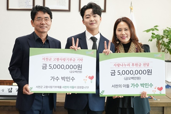10일 소속사 뉴에라프로젝트에 따르면 박민수는 최근 서천군 신청사 개청식 및 제61회 군민의 날 기념식에 참석해 고향사랑기부금과 사랑나누리 후원금으로 총 1000만 원을 기부했다.