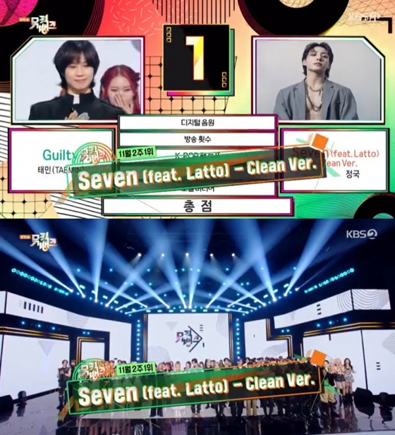 이날 정국 'Seven (feat. Latto)'(세븐)이 1위를 차지했다. 정국은 1위 후보로 태민 'Guilty'(길티)와 대결했다.