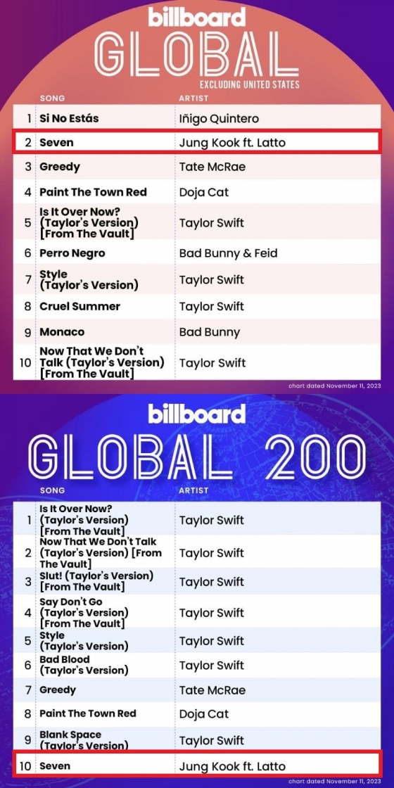 정국이 지난 7월 14일 발매한 솔로 싱글 'Seven'은 미국 음악 매체 빌보드의 11월 11일 자 '글로벌(미국 제외)' 차트에서 2위를 차지했다. 'Seven'은 빌보드 '글로벌200' 차트에서는 10위에 이름을 올렸다.