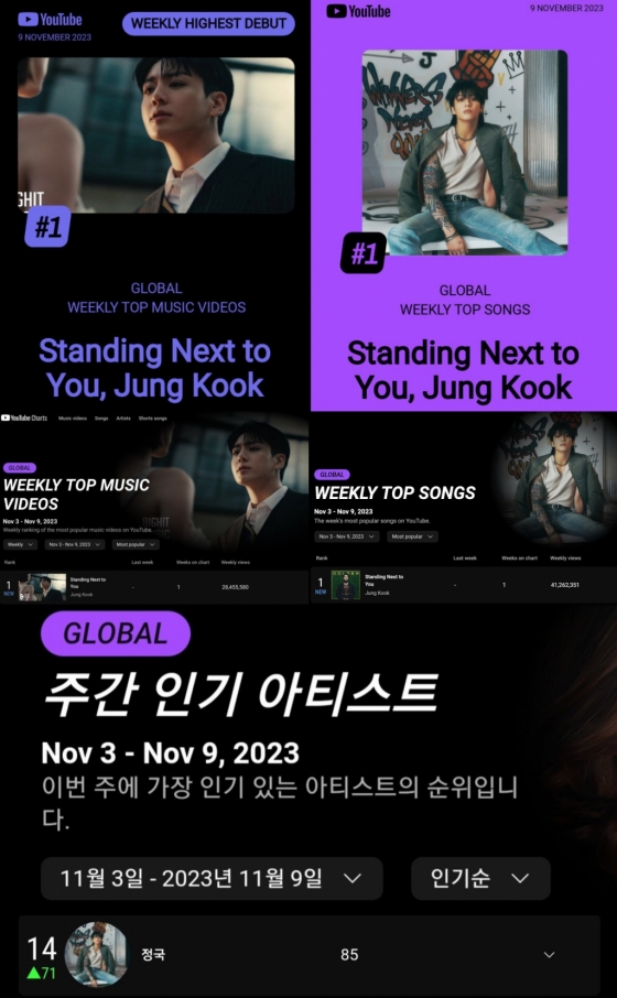 정국의 ''Standing Next to You'는 11월 3일~9일 자 글로벌 주간 인기 뮤직비디오 차트 1위를 차지했다.