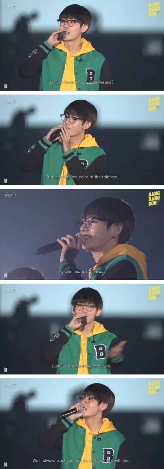 뷔는 "여러분 보라색깔의 뜻이 뭔지 아세요? 빨주노초파남보에서 보라색이 마지막 색깔이잖아요. 보라색은 상대방을 믿고 서로 오랫동안 사랑하자는 의미인데요. 네, 제가 방금 지었어요. 그 뜻처럼 오랫동안 함께 볼 수 있었으면 좋겠어요" 라고 즉석에서 만들었다.