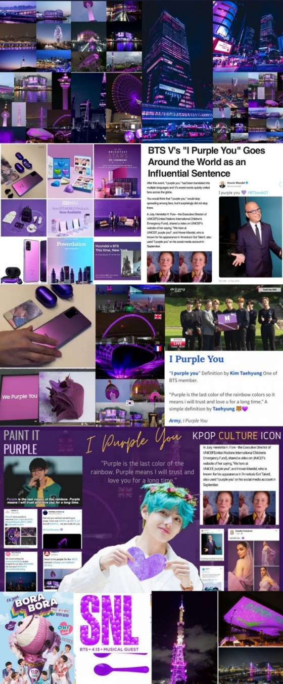 방탄소년단이 유니세프와 'LOVE MYSELF' 캠페인을 펼칠 때는 유니세프는 홈페이지에 "We here at UNICEF purple you!"라고 올리기도 했다.