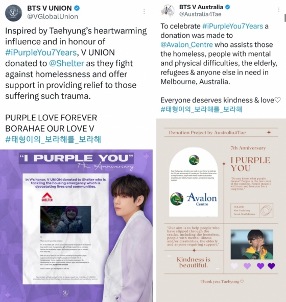 방탄소년단(BTS) 뷔가 만든 '보라해'(I Purple You) 탄생 7주년을 맞아 전 세계 팬들이 축하와 기부로 기념했다.