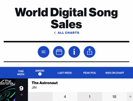 지난 해 10월 28일에 발매된 진의 한국어 노래이자 첫 솔로 싱글 '디 애스트로넛'은 11월 14일 발표된 빌보드 '월드 디지털 송 세일즈 차트'(World Digital Song Sales Chart)에서 9위를 차지했다. 지난주 4위에 이어 2주 연속 TOP 10에 진입하며 발매된 지 1년이 넘어도 여전히 폭발적인 인기를 증명했다.