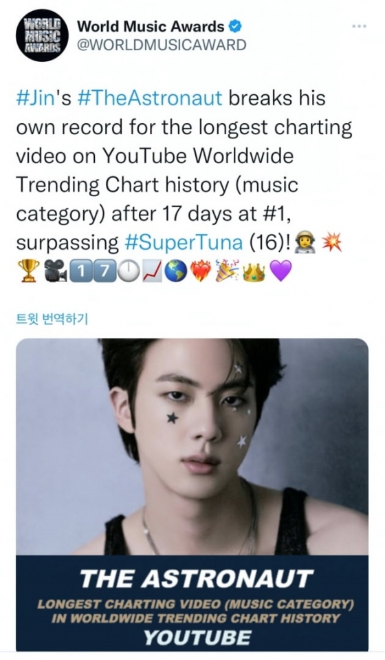 '디 애스트로넛' 뮤직비디오는 '전 세계 유튜브 인기 동영상 음악 부문'에서 K팝 솔로 최초이자 최장인 17일 연속 1위를 기록, 종전의 K팝 솔로 최고 기록인 진의 '슈퍼 참치' 16일 연속 1위를 뛰어넘으며 신기록을 자체 경신하는 독보적인 파워를 보였다.