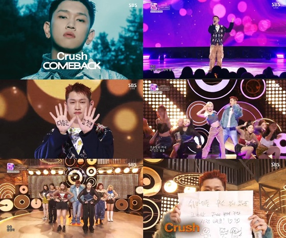 크러쉬는 19일 오후 방송된 SBS 음악 프로그램 '인기가요'에 출연해 정규 3집 '원더이고'(wonderego)의 쿼드러플 타이틀곡 중 '흠칫'(Hmm-cheat)과 '미워(Ego) 무대를 공개했다.