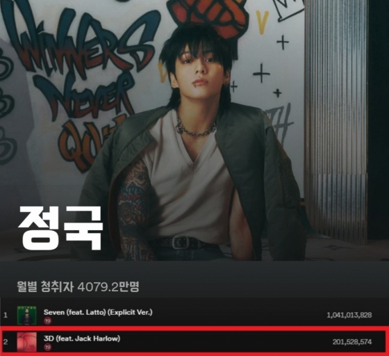 정국은 솔로 싱글 'Seven'을 비롯해 솔로곡 'Euphoria'(유포리아), '시차'(MyTime), 미국 싱어송라이터 찰리 푸스와 협업곡 'Left and Right'(레프트 앤드 라이트), '2022년 FIFA(피파) 카타르 월드컵' 공식 사운드트랙 'Dreamers'(드리머스), 웹툰 OST 'Stay Alive'(스테이 얼라이브)와 함께 '3D'까지 통산 7번째 2억 이상 스트리밍된 곡을 보유하게 됐다.
