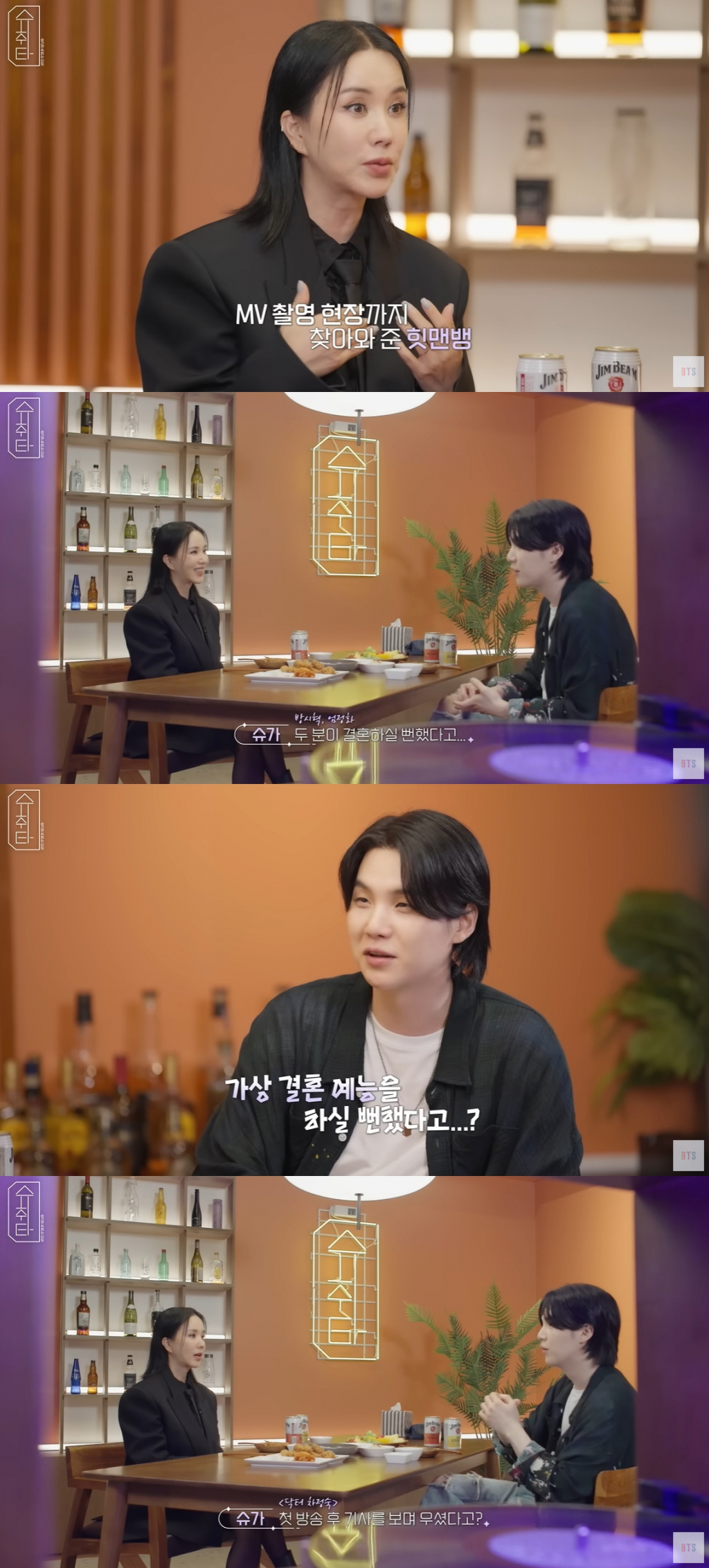 이날 슈가는 "한 3년 전인가 작곡가 형이랑 있는데 (엄정화가) 옆 테이블에 있던 걸 기억한다. 그때 말 못 나누고 인사만 드린 기억이 있다"라며 엄정화에게 인사했다. 그러면서 최근 인기를 실감하냐고 묻자, 그는 "고려대학교 축제에 올랐는데 '차정숙'이라고 하고 그 열기가 느껴지더라. 막 크게 부르니까 진짜 행복하더라"라고 기뻐했다.