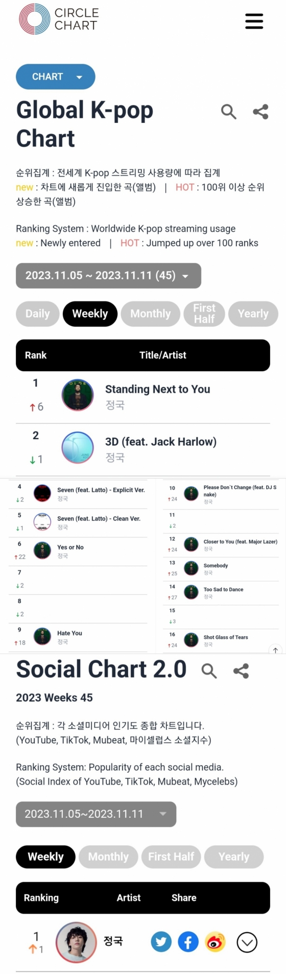 써클차트(구 가온차트)를 운영하는 한국음악콘텐츠협회에 따르면, 정국의 'GOLDEN'(골든) 앨범 타이틀곡 'Standing Next to You'(스탠딩 넥스트 투 유)는 써클차트 주간 글로벌 K-팝(11월 5일~11일 자)에서 1위를 차지했다.