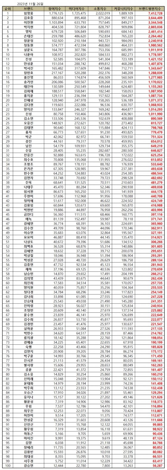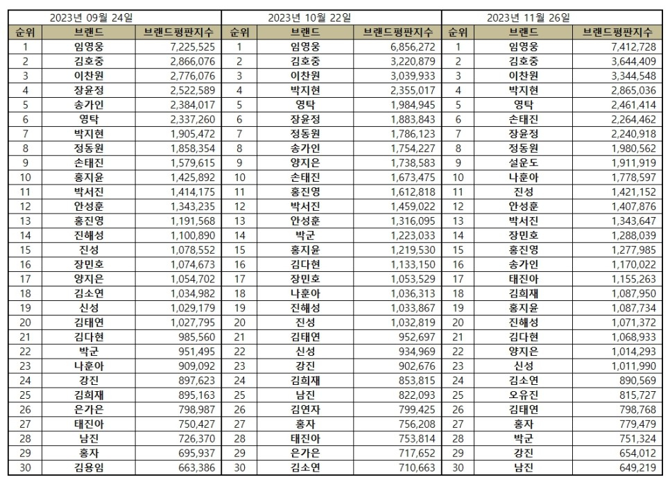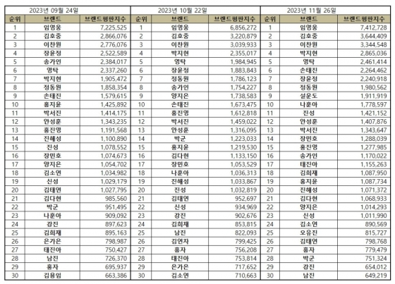 2023년 11월 트로트 가수 브랜드평판 30위 순위는 임영웅, 김호중, 이찬원, 박지현, 영탁, 손태진, 장윤정, 정동원, 설운도, 나훈아, 진성, 안성훈, 박서진, 장민호, 홍진영, 송가인, 태진아, 김희재, 홍지윤, 진해성, 김다현, 양지은, 신성, 김소연, 오유진, 김태연, 홍자, 박군, 강진, 남진 순으로 분석됐다.