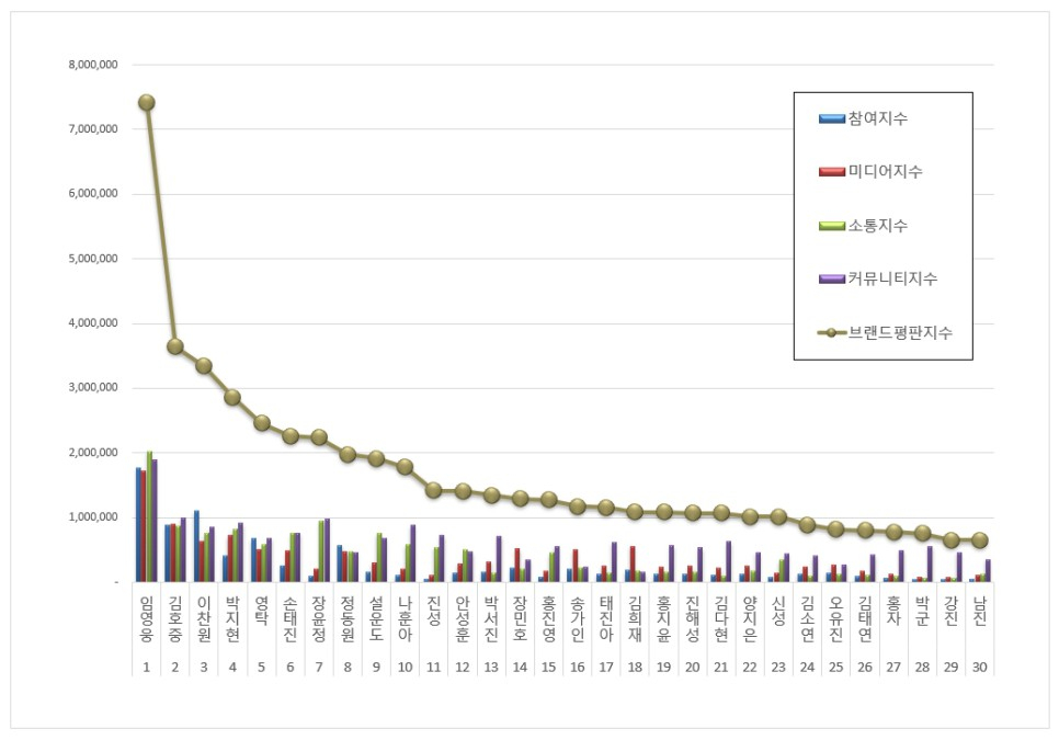 1위 임영웅 브랜드는 참여지수 1,776,125 미디어지수 1,725,475 소통지수 2,022,019 커뮤니티지수 1,889,109가 되면서 브랜드평판지수 7,412,728로 분석됐다. 지난 10월 브랜드평판지수 6,856,272와 비교해보면 8.12% 상승했다.