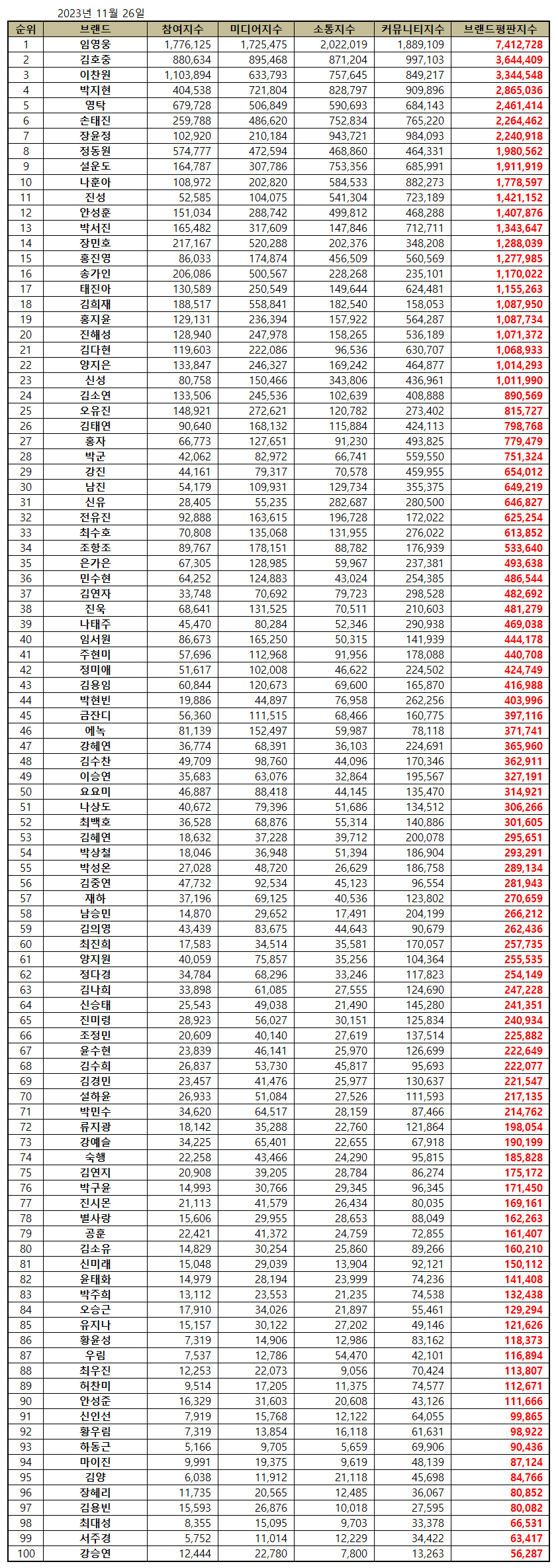 임영웅은 11월 26일 한국기업평판연구소가 발표한 트로트 가수 브랜드평판 2023년 11월 빅데이터 분석결과, 1위를 차지했다. 35개월 연속 1위 기록이다. 1위 임영웅에 이어 2위 김호중, 3위 이찬원 순이었다.