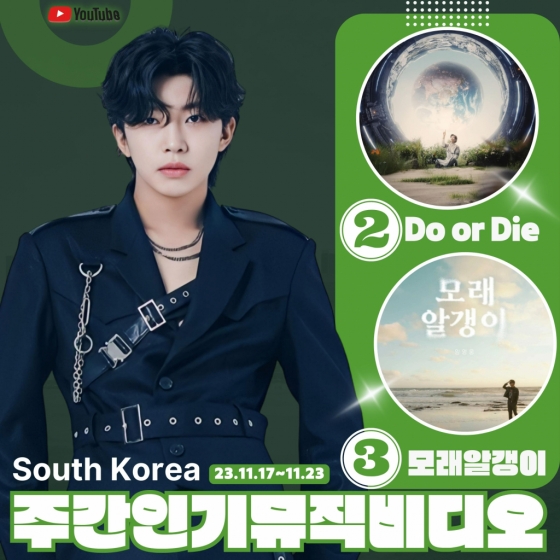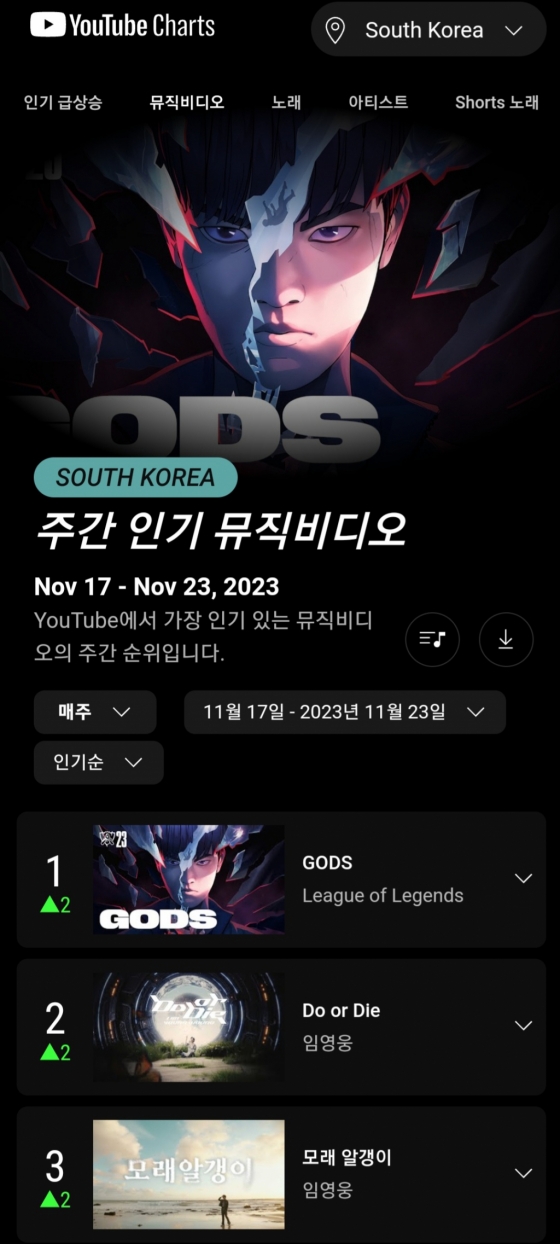 임영웅은 2023년 11월 17일~11월 23일 유튜브 한국 주간 인기 뮤직비디오 차트 2위와 3위를 차지했다.