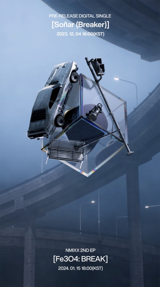 모션 포스터에는 짙은 안개가 가로등 불빛마저 옅게 만드는 황량한 거리 위 자동차, 신호등, 벤치 등 온갖 사물을 자석처럼 끌어당기는 정육면체 투명 물체가 등장해 기묘한 느낌을 자아냈다. 정육면체가 깨지면서 흩어진 파편들이 원소 기호 같은 모양을 만들더니 곧 신보명 'Fe3O4: BREAK'라고 재구성되는 연출이 강한 임팩트를 전한다. 'Fe3O4'는 자성물질의 화학 기호 중 하나로, 선공개 싱글 'Sonar (Breaker)'의 'Sonar'는 '꿈을 꾸다'라는 뜻이다. NMIXX는 신선함을 주는 앨범명처럼 색다른 매력을 펼치고 팬심을 달굴 것으로 기대를 모은다.