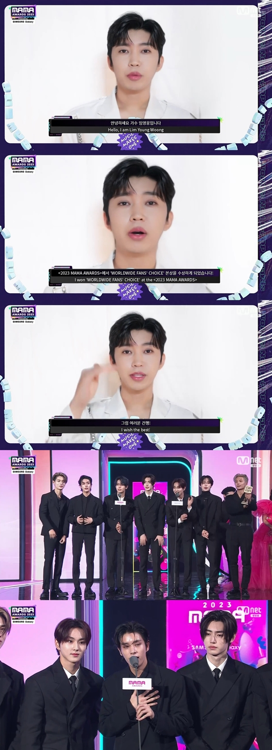 '2023 MAMA AWARDS'에서 'WORLDWIDE FANS' CHOICE'(월드 와이드 팬스 초이스)를 수상한 임영웅, 그룹 엔하이픈/사진=Mnet '2023 MAMA AWARDS' 방송 화면 캡처