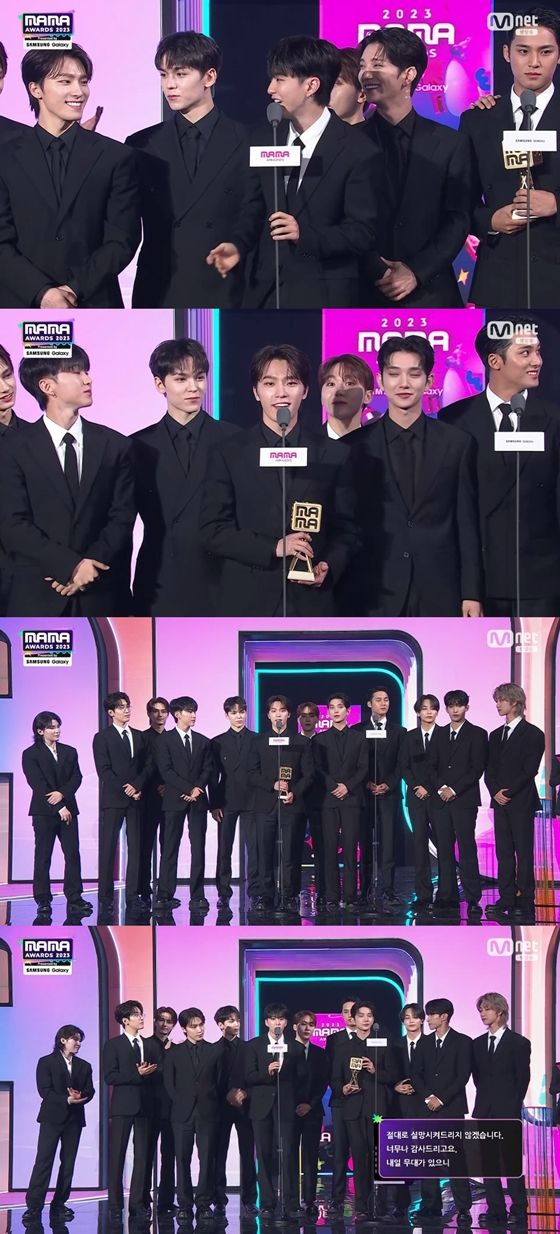 세븐틴은 "전 세계 저희 팬들께서 이렇게 멋진 상을 주신 것 감사드립니다"라면서 "절대로 실망시켜드리지 않겠습니다"라고 수상 소감을 전했다.