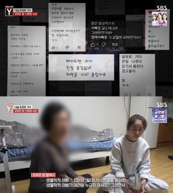 오유진은 2009년생으로 올해 14세이며 중학교 2학년생이다. 오유진의 스토킹 피해 내용은 지난 10일 방송된 SBS '궁금한 이야기 Y'에서도 알려졌는데, A씨는 오유진의 명예를 훼손하는 댓글을 1000여개나 달았고, "생물학적 아빠가 있는데 진실을 밝혀라"라며 자신의 얼굴 사진을 올리며 자신이 오유진의 친아빠라고 주장했다.