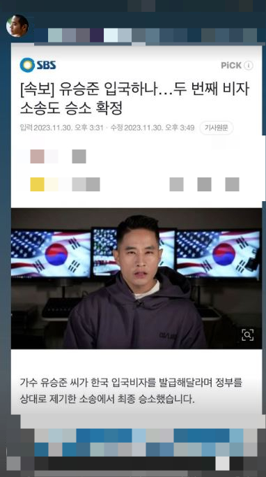 판결 직후 유승준도 자신의 인스타그램을 통해 대법원 확정 판결 소식을 직접 공유하며 근황을 전하기도 했다.