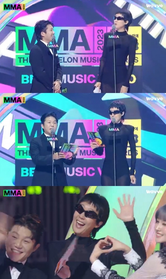 이날 'MMA2023' 올해의 신인상 시상자로 홍진경과 조세호가 등장했다. 홍진경은 수영복 실루엣의 개성있는 시스루 드레스와 독특한 프레임의 선글라스를 착용하고 무대에 올라 시선을 사로잡았다.