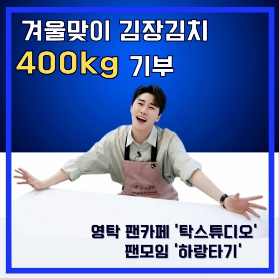 가수 영탁의 팬클럽 '탁스튜디오'의 팬모임 '하랑타기(영탁不敗 인천 내 사람들)'는 지난 2일 사회복지 법인 예원에 김장 김치 400kg를 전달했다.