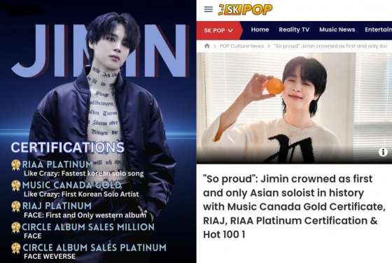 또한 일본에서는 웨스턴 앨범(WESTERN ALBUM)으로는 최초이자 유일하게 '페이스'가 25만장 이상의 판매로 일본 레코드협회(RIAJ)의 '골든 디스크 플래티넘' 인증을 획득함으로써 지민은 빌보드 '핫 100' 1위에 이어 미국, 일본 플래티넘과 캐나다 골드 인증을 받는 유일무이한 기록을 세웠다.