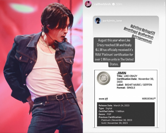 실제로 '라이크 크레이지'는 지난 8월 26일 미국에서 이미 100만 유닛을 돌파해 한국 솔로이스트의 솔로곡으로 2023년 발매된 곡 중 최초 플래티넘 자격을 갖추었으나 소속사가 협회에 제출해야 하는 요건에 따라 3개월이 지난 11월 30일에서야 최종 인증 획득에 성공했다.