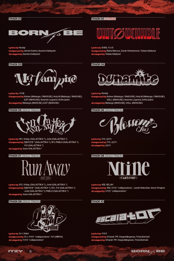 여기에 'BORN TO BE', 'Mr. Vampire', 'Dynamite'(다이너마이트), 'Crown On My Head (예지)'(크라운 온 마이 헤드 (예지)), 'Blossom (리아)'(블러썸 (리아)), 'Run Away (류진)'(런 어웨이 (류진)), 'Mine (채령)'(마인 (채령)), 'Yet, but (유나)'(옛, 벗 (유나)), 'Escalator'(에스컬레이터)까지 총 10곡이 수록됐으며, 멤버들은 자신의 첫 솔로곡 작사, 작곡에 직접 참여했다.