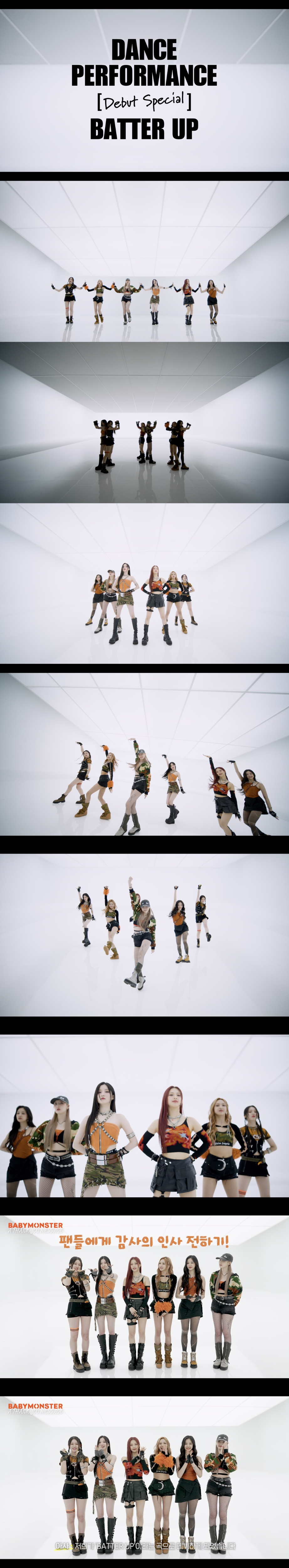 YG엔터테인먼트는 4일 공식 블로그에 'BABYMONSTER - 'BATTER UP' DANCE PERFORMANCE (DEBUT SPECIAL)'을 게재했다. 경쾌한 오렌지 포인트의 밀리터리룩을 입은 베이비몬스터는 독보적인 아우라를 발산했다.