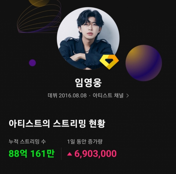 임영웅은 12월 5일 기준 국내 주요 음원 플랫폼 멜론(Melon)에서 누적 스트리밍 88억 회를 넘어섰다.