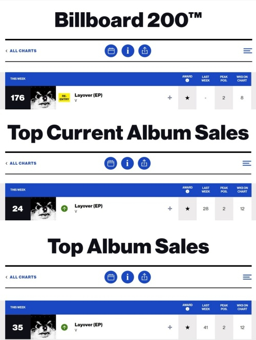 12월 5일(현지시간) 미국 음악 전문 매체 빌보드가 발표한 최신 차트(12월 9일 자)에 따르면, 뷔의 솔로 앨범 '레이오버'(Layover)는 빌보드 메인 앨범차트 '빌보드 200'에 재진입했다.
