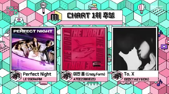 9일 방송된 MBC '쇼! 음악중심'에서는 1위 후보에는 르세라핌의 Perfect Night', 에이티즈의 '미친 폼(Crazy Form)', 태연의 'To. X'가 이름을 올렸다.