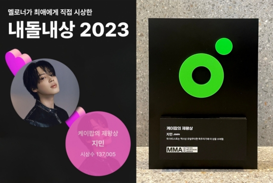 방탄소년단(BTS) 지민이 '멜론 뮤직어워드 2023'(Melon MusicAwards 2023, 이하 MMA2023)에서 '케이팝의 제왕상'을 수상하며 인기를 빛냈다.