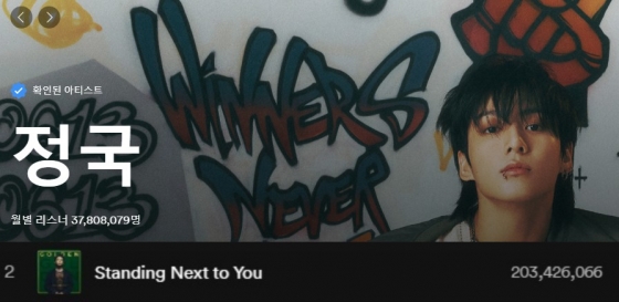 지난달 3일 정국이 발매한 솔로 앨범 'GOLDEN'(골든) 타이틀곡 'Standing Next to You'(스탠딩 넥스트 투 유)는 최근 스포티파이에서 2억 스트리밍을 넘어섰다.