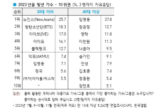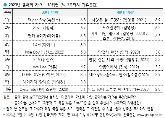 임영웅의 '모래 알갱이'는 40대 이상에서 올해 최고의 가요로 꼽혔다(6.9%). 30대 이하에서는 뉴진스의 'Super Shy'(6.8%)가 올해 최고의 가요로 나타냈다.