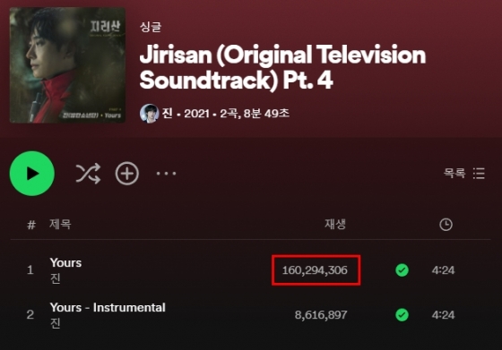 진의 첫 솔로 OST곡인 '유어스'는 12월 19일 세계 최대의 음원 플랫폼 스포티파이에서 1억 6000만 스트리밍을 돌파했다.