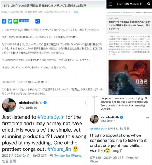 미국의 저널리스트이자 뮤직 퍼블리시스트인 니콜라스 리들은 진의 '유어스'를 듣고, "'유어스'를 처음 들었는데 울었는지 안 울었는지조차 모르겠어요" 라며 진의 아름다운 보컬에 극찬을 던졌다. 이어 "제 결혼식에서 이 노래가 나오면 좋겠어요. 가장 예쁜 노래 중 하나인 '유어스'입니다"라는 호평과 함께 #YoursByJin, #Yours_jin 이라는 해시 태그를 올려 해당 곡에 대한 애정을 드러내기도 했다.