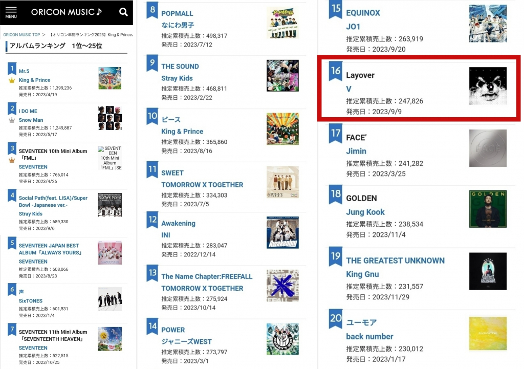 일본 오리콘이 12월 20일 발표한 '연간 랭킹 2023'(집계기간 2022년 12월 26일~2023년 12월 18일)에 따르면, 뷔의 솔로 앨범 '레이오버'는 판매량 24만 7826장으로 '앨범 랭킹' 16위를 차지했다. 이는 K팝 솔로아티스트 중 최고 순위다.
