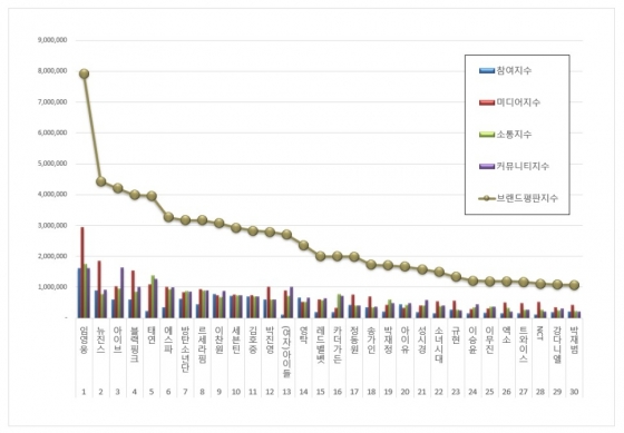 1위 임영웅 브랜드는 참여지수 1,605,542 미디어지수 2,938,992 소통지수 1,753,558 커뮤니티지수 1,622,336이 되면서 브랜드평판지수 7,920,428로 분석됐다. 지난 11월 브랜드평판지수 7,209,898과 비교해보면 9.85% 상승했다.