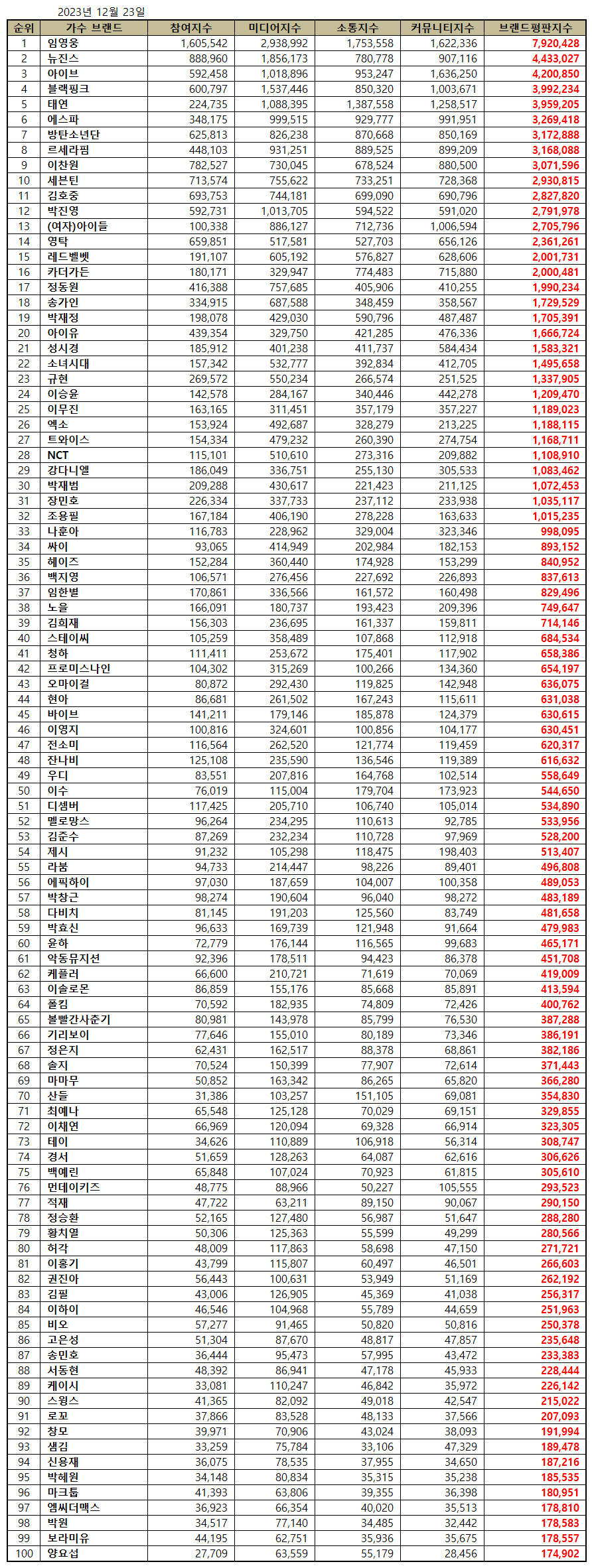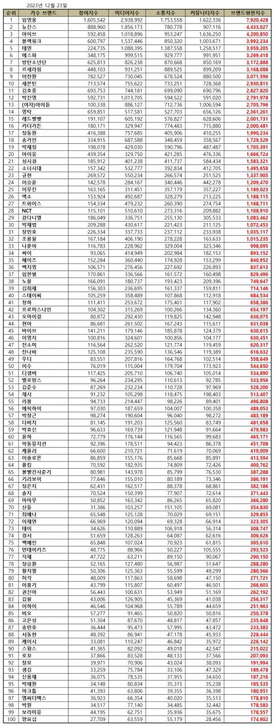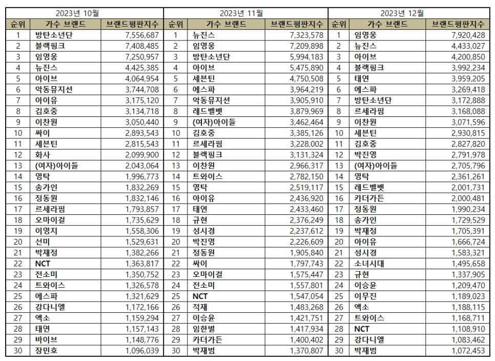 2023년 12월 가수 브랜드평판 30위 순위는 임영웅, 뉴진스, 아이브, 블랙핑크, 태연, 에스파, 방탄소년단, 르세라핌, 이찬원, 세븐틴, 김호중, 박진영, (여자)아이들, 영탁, 레드벨벳, 카더가든, 정동원, 송가인, 박재정, 아이유, 성시경, 소녀시대, 규현, 이승윤, 이무진, 엑소, 트와이스, NCT, 강다니엘, 박재범 순으로 분석되었다.
