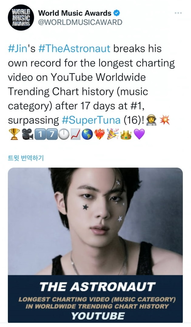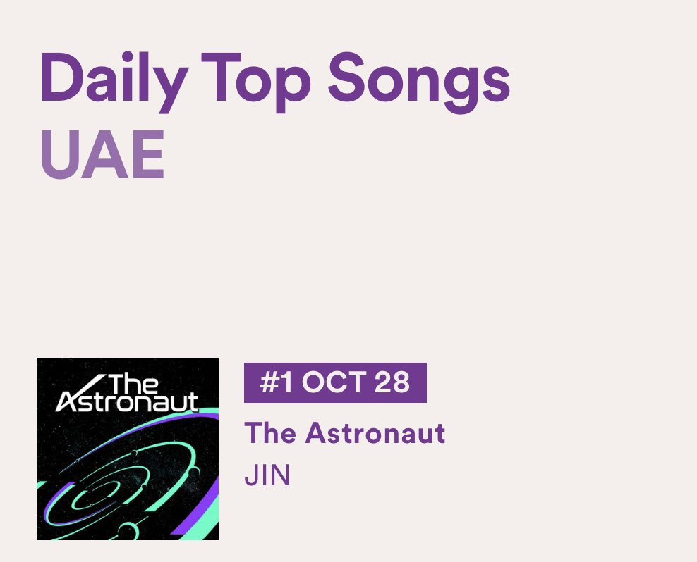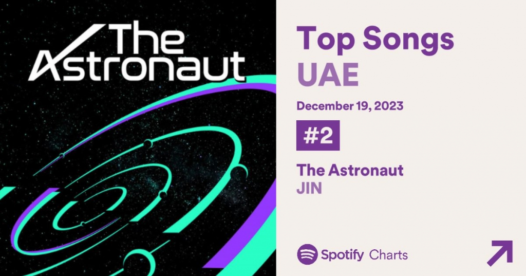 진의 첫 솔로 싱글 '디 애스트로넛'은 현지 시간 지난 12월 19일, 세계 최대 음원 플랫폼 스포티파이(Spotify) '데일리 톱 송 아랍에미리트' 차트에서 2위를 차지했다.