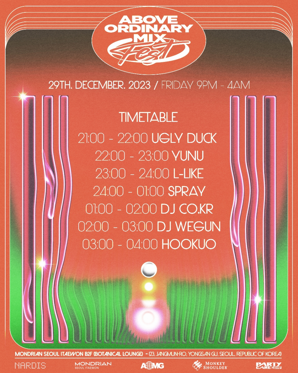 화려한 DJ 라인업으로 기대를 더하고 있는 'AOMIX FEST #5'는 29일 오후 9시부터 30일 오전 4시까지 총 7시간에 걸쳐 서울 용산구에 위치한 몬드리안 서울 이태원에서 진행된다. MONKEY SHOULDER, NARDIS, Healy PARTY CARE가 스폰서로 참여하며, 티켓은 파티 당일 현장에서 만 19세 이상만 구매할 수 있다.