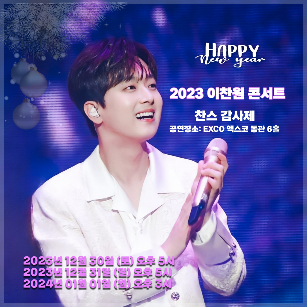 이찬원은 12월 30일부터 1월 1일까지 대구 대구 EXCO 동관 6홀에서 '2023 이찬원 콘서트 '찬스 감사제'' 대구 공연을 펼친다.