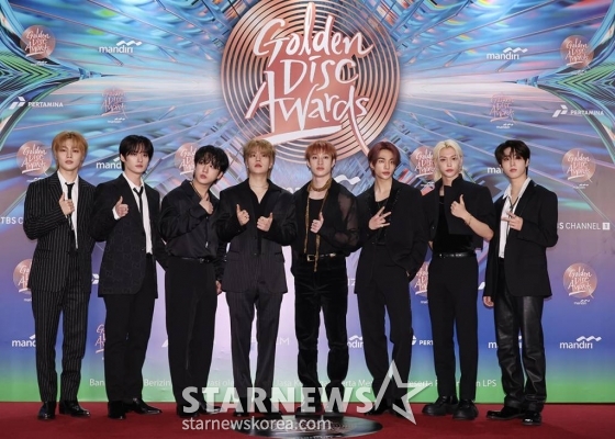 그룹 스테레이키즈가 6일 오후 인도네시아 자카르타 인터내셔널 스타디움에서 개최된 '제38회 골든디스크 어워즈 with 만디리' 레드카펫 행사에 참석해 포즈를 취하고 있다. /사진제공=골든디스크 어워즈 사무국 2024.01.06 /사진=이동훈