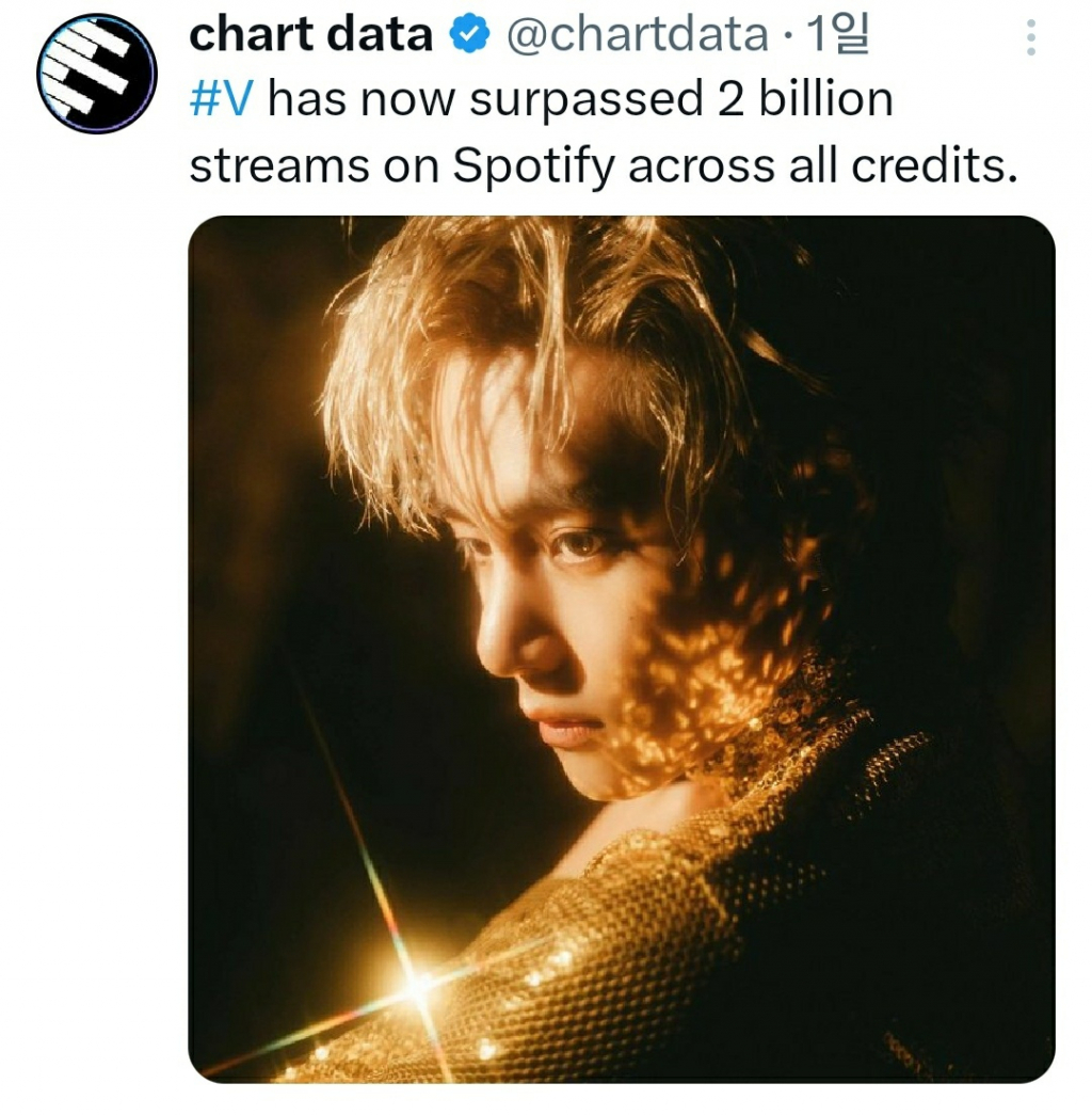 차트데이터(Chart Data)에 따르면 뷔는 스포티파이 크레디트 곡 기준 총 20억 스트리밍을 돌파했다.