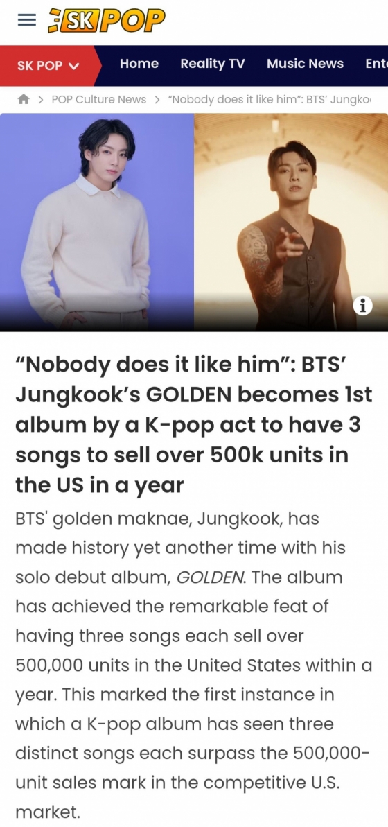 미국 한류 매체 'SK Pop Culture'(SK 팝 컬처)는 "정국의 첫 번째 솔로 앨범 'GOLDEN'(골든) 3곡이 1년 안에 미국에서 각각 50만 유닛 이상 판매됐다"라고 보도하며 "황금 막내 정국이 'GOLDEN'으로 또 한 번 역사를 썼다"고 전했다.